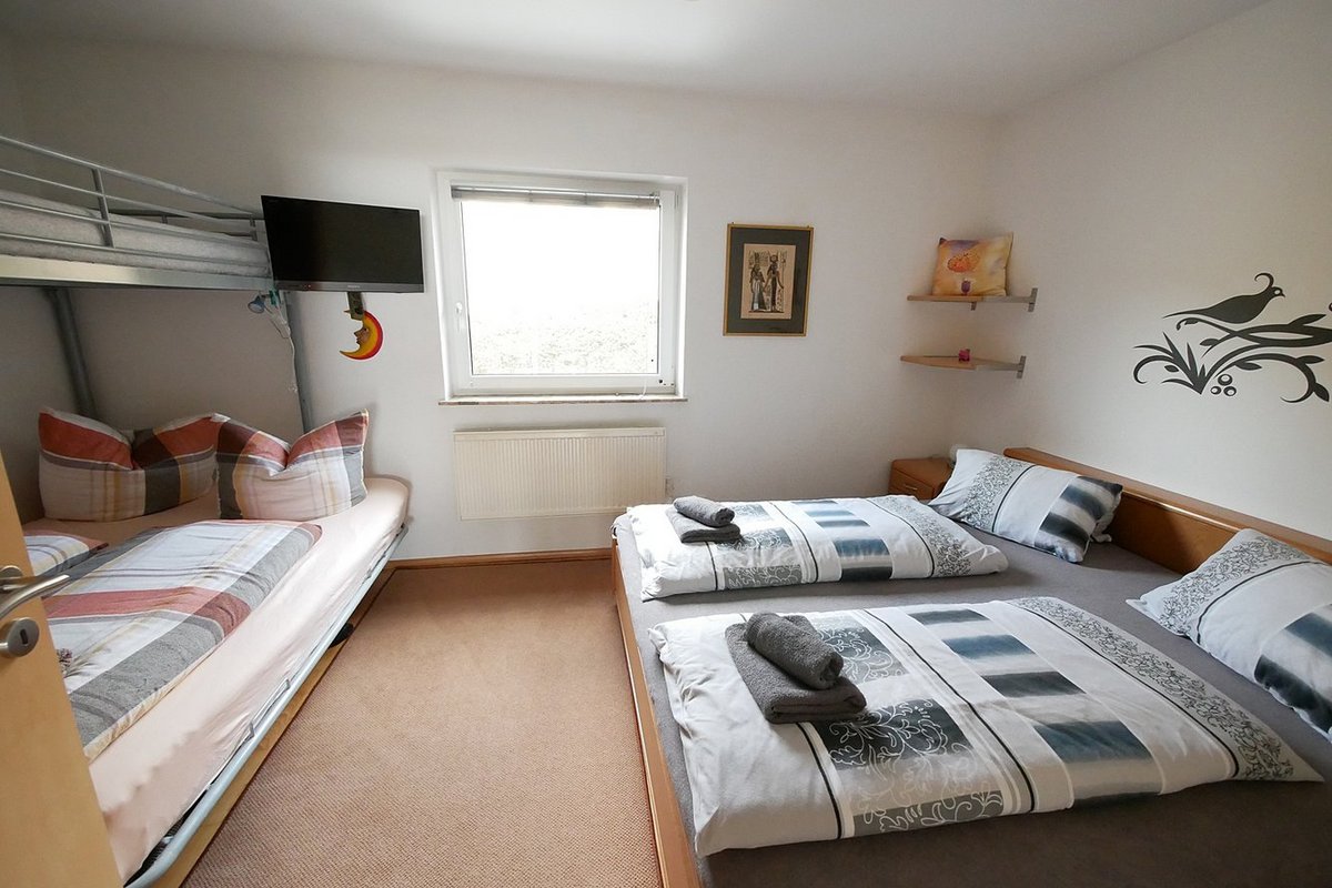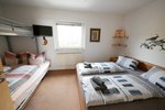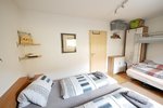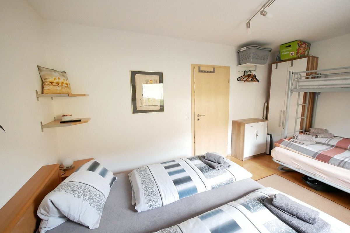 Vorraum mit kleiner Garderobe, 1 Schlafzimmer mit Doppelbett und großem Stockbett, Badezimmer mit Dusche und WC, Wohnzimmer mit offener Küche und Ausgang auf den Südbalkon.